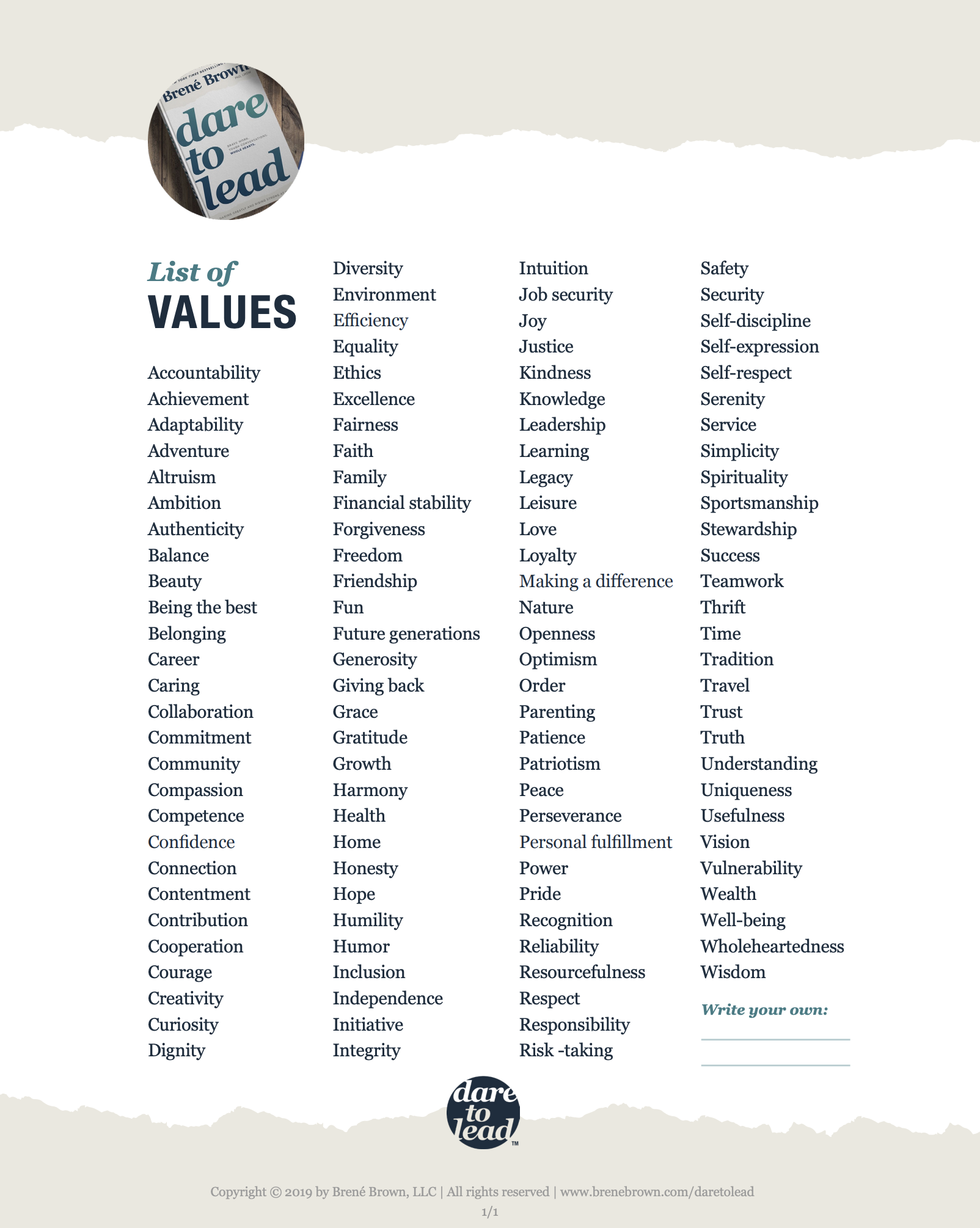 STARTING WITH THE PDF INSERTED BELOW: I was listening to a recent Brene Brown podcast and she suggested an exercise of selecting your two top values. Since I was listening on the podcast, I wasn’t able to access the list of suggested words or values but as Brene continued on her podcast, I knew what my first value would be even though it was not one being discussed. Honesty. For whatever reason has always been so core to my personality. I remember trying to lie as a child and later as a teen and I just could not do it! I was bad at it and it went against every part of me. I have been told that I may even be too honest for my own good. Is that a thing??