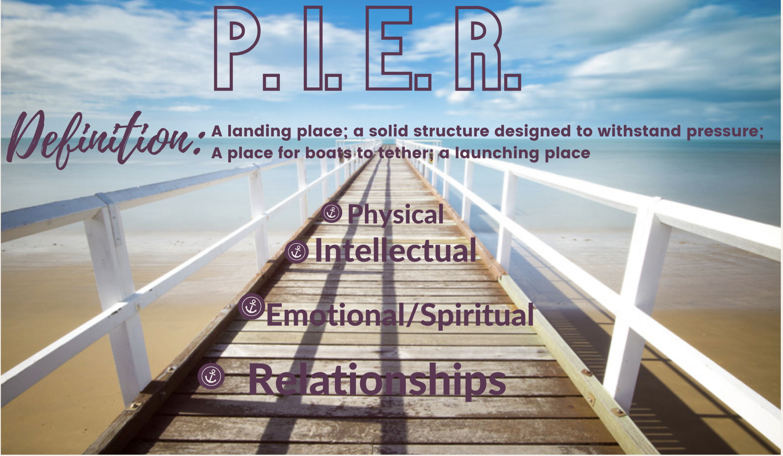 I love how the analogy of a P.I.E.R. fits so perfectly with my understanding of human development. A pier is considered both a landing place as well as a launching place. A pier is a solid structure that is designed to withstand pressures and allow boats to tether. What I would like to suggest is that as we focus on developing ourselves in each of these areas, we will find ourselves grounded and able to withstand outside or external pressures that will inevitably come.