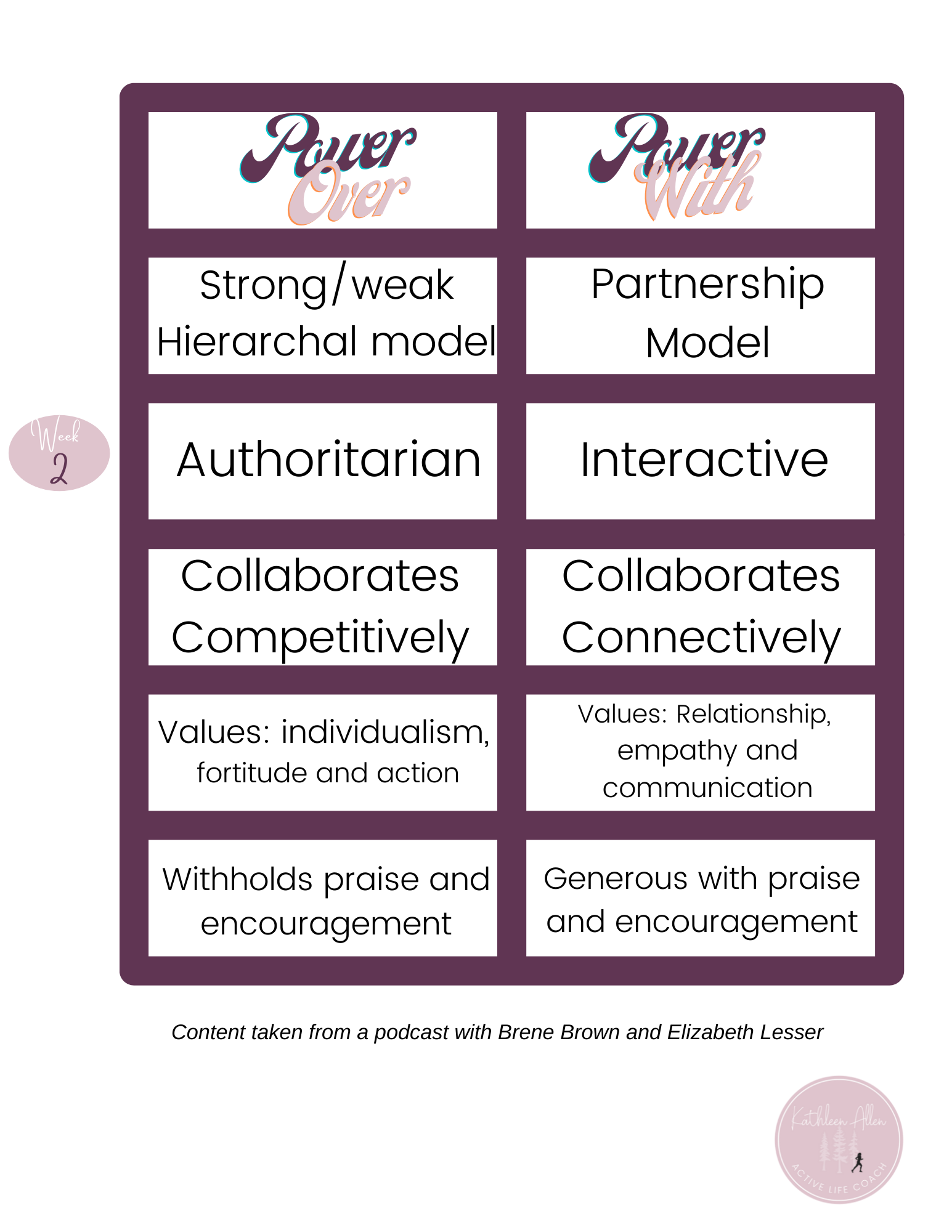 In a most powerful (pun intended) podcast Brene Brown interviews Elizabeth Lesser on the power of women’s stories. Within the podcast Brene mentions the components of Power Over vs. Power With. Most often I have heard this discussed as it relates to a corporation, community, organization, or even a family. For the next several weeks I am discussing how each component can be applied to accessing individual power. This is week 2 in the series.
